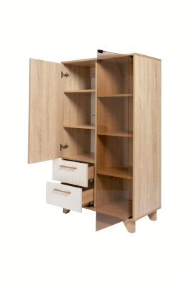 Стеллаж со стеклом — это практичное и дизайнерское решение для гостиной. Стеллаж имеет семь полок и два ящика. Ящики оснащены шариковыми направляющими полного выдвижения. Створки выполнены из ЛДСП и стекла, что позволяет хранить как необходимые предметы, так и предметы декора.