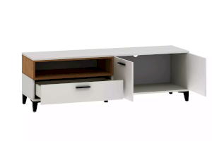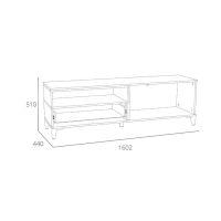 Тумба оснащена полками за распашными дверками и ящиком, который выдвигается плавно и бесшумно благодаря шариковым направляющим. Открытая ниша может быть собрана как на правую, так и на левую стороны, и в ней можно удобно расположить книги или элементы декора, а высокие опоры придают внешнюю легкость и обеспечивают быстрый и легкий доступ во время уборки.