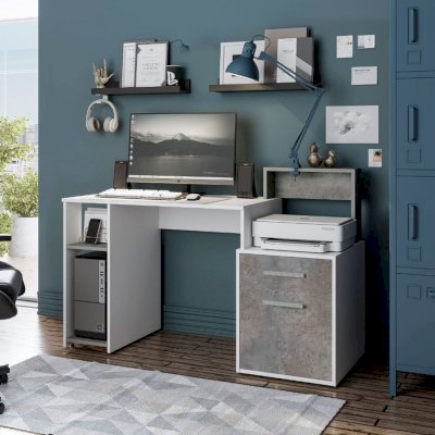 Компьютерный стол Лайф – это не просто стол, это полноценно оборудованное рабочее место. Модель состоит из вместительной столешницы, открытых и закрытых полок, а также небольшого выдвижного ящика для мелких вещей. Изделие выполнено из ЛДСП в сочетании цветов белый и метрополитан грей, оно прекрасно впишется в светлый современный интерьер.