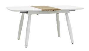 Обеденный стол раскладной. Столешница выполнена из прочного и долговечного МДФ. Светлая глянцевая поверхность столешницы гармонично сочетается с металлическими ножками. Простая прямоугольная форма стола позволит легко вписать его в современный интерьер, стол украсит кухню, гостиную или современное кафе, ресторан. Дополнительная вкладка стола выполнена из МДФ с бумажным шпоном цвета беленого дуба. На вкладке предусмотрена петля для комфортного открытия стола одной рукой.