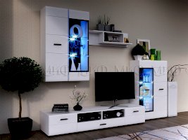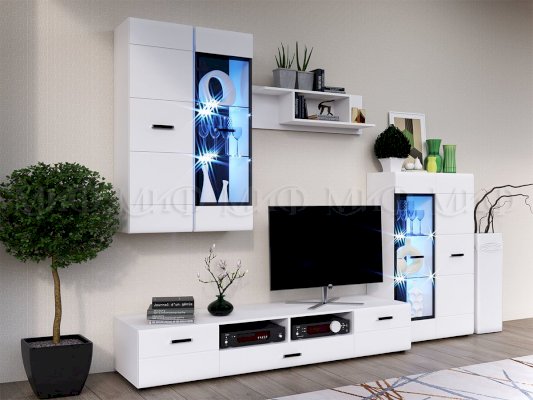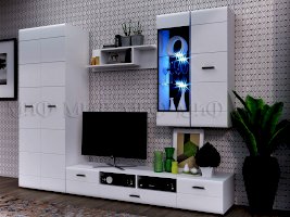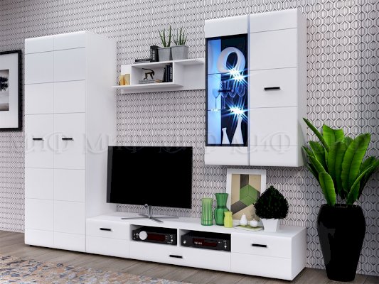 Изысканная, белоснежная с приятным блеском гостиная, несомненно украсит собой любую квартиру или дом. В гостиной есть все необходимые элементы для красивого оформления комнаты. Фасады с фрезеровкой и стеклянные витрины создают современный и стильный образ вашему дому.