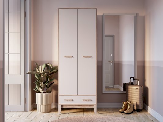 Двухстворчатый шкаф «Скандика» выполнен из качественной ЛДСП в оттенках дуб смоки/кашемир. Матовые фасады практичны в использовании. Модель состоит из нижнего выкатного ящика, двух распашных дверок, за которыми находится отделения с хромированной штангой, вместительная верхняя полка и встроенный блок с двумя дополнительными полками. Створки плотно фиксируются на магнитах.