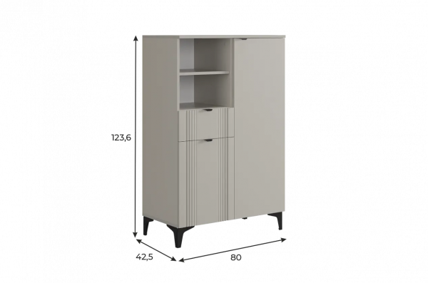 Дизайн комода продуман до мелочей: с одной стороны расположена глухая дверца, за которой скрывается просторное пространство для хранения. С другой стороны – ниша с открытой полкой, выкатной ящик и ещё одна глухая дверца, что позволяет гибко организовать хранение и поддерживать порядок в доме.
