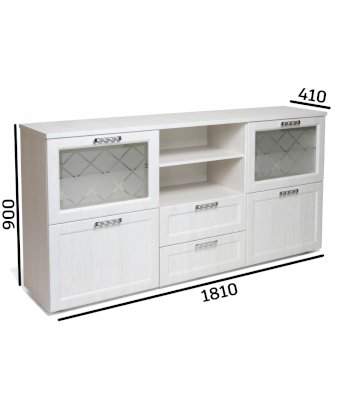 Дизайн комода функциональный и эстетичный. В конструкции все продумано до мелочей: есть два выдвижных ящика для небольших предметов, две открытые полки предназначены для предметов, которые хочется оставить на виду. Дверки со стеклом придают легкость. просторная столешница может послужить как для размещения телевизора, так и для любимых книг, статуэток и других аксессуаров.
