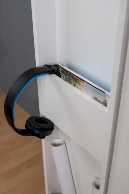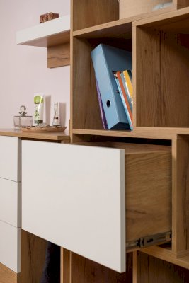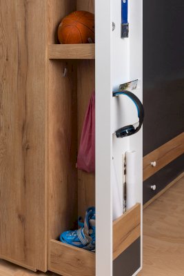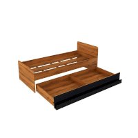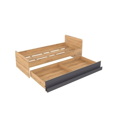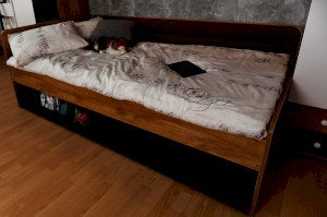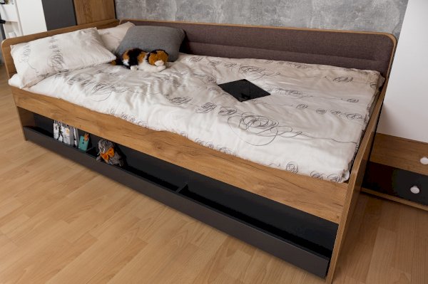 Подростковая кровать-тахта с большим выкатным ящиком на роликах, который можно использовать как место для хранения или как дополнительное спальное место. Он открывается за ручку-карман. Такой импровизированный карман дает возможность аккуратно сложить необходимые перед сном вещи: книгу, телефон, любимую игрушку.