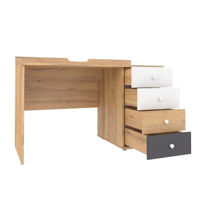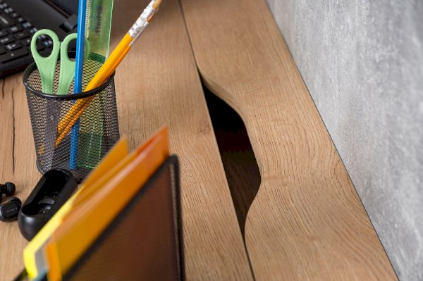 Стол отличается нестандартным решением для столешницы, которая максимально адаптирована для потребностей современных детей и работе на компьютере. Под откидной её частью, открывающейся за плавный вырез, прячется ниша для хранения и отверстие для вывода проводов, чтобы они не запутывались и не мешали ребенку.